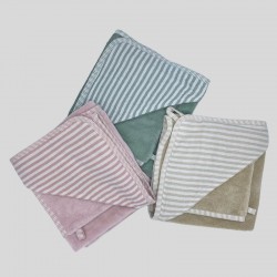 Jolie sortie de bain en bambou, avec capuche en double gaze à rayures pour envelopper tout en douceur les bébés à la sortie du bain.