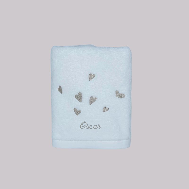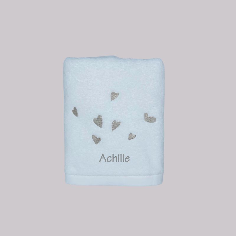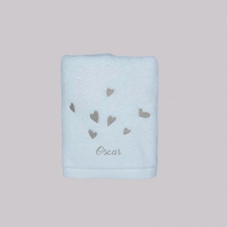 Envol de cœurs brodés au centre dans le bas de la serviette.