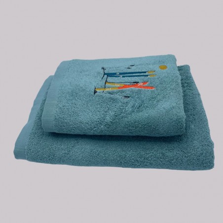 Skis multicolores brodés au centre dans le bas de la serviette.