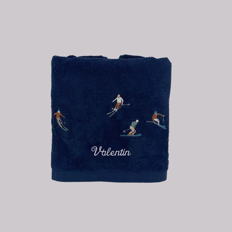 Skieurs multicolores brodés au centre dans le bas de la serviette.